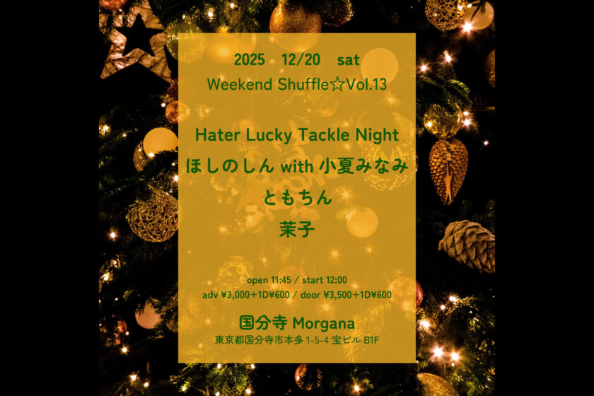 ☀️ “Weekend Shuffle☆Vol.13” 12月 20 Sat 2025 Booking "Weekend Shuffle☆Vol.13" 出演 ・Hater Lucky Tackle Night ・ほしのしんwith小夏みなみ ・ともちん ・茉子 開場/開演 11:45/12:00 前売/当日 ¥3000/¥3500 +1D¥600 チケット取り置きフォーム 前のスケジュール 次のスケジュール