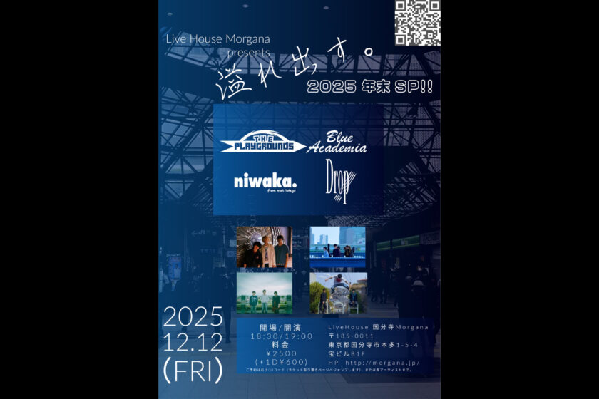 🌙 “溢れ出す。2025 年末sp!!” 12月 12 Fri 2025 Booking "溢れ出す。2025 年末sp!!" 出演 ・THE PLAYGROUNDS ・Blue Academia ・niwaka. ・Drop!!!! 開場/開演 18:30/19:00 料金 ¥2500+1D¥600 チケット取り置きフォーム 前のスケジュール 次のスケジュール