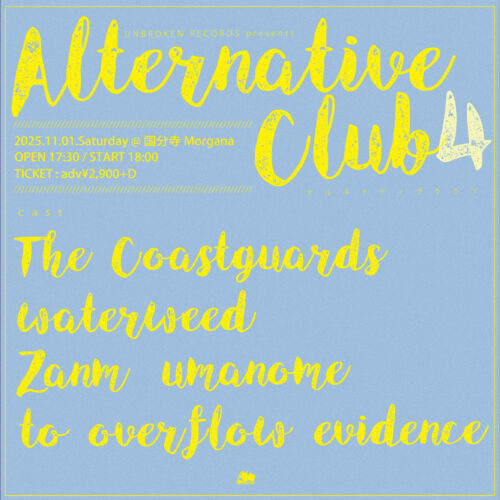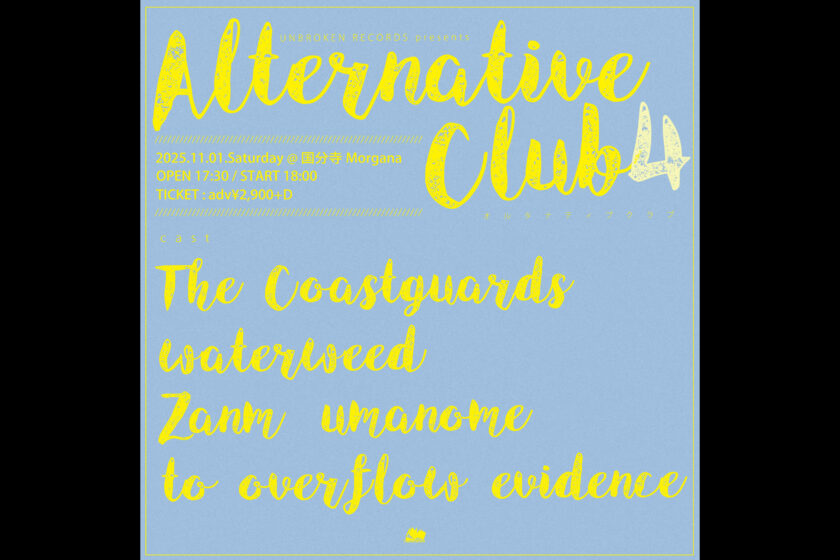 UNBROKEN RECORDS presents “Alternative Club 4” 11月 1 Sat 2025 EVENT UNBROKEN RECORDS presents "Alternative Club 4" 出演 ・The Coastguards ・waterweed ・Zanm ・umanome ・to overflow evidence 開場/開演 17:30/18:00 前売 ¥2900+1D¥600 チケット取り置きフォーム 前のスケジュール 次のスケジュール