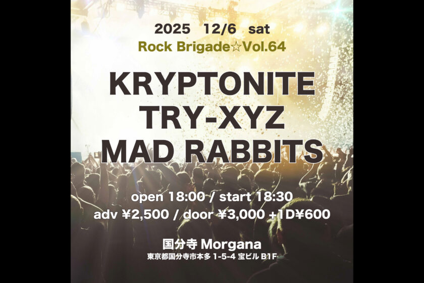 “Rock Brigade☆Vol.64” 12月 6 Sat 2025 Booking "Rock Brigade☆Vol.64" 出演 ・KRYPTONITE ・TRY-XYZ ・MAD RABBITS 開場/開演 18:00/18:30 前売/当日 ¥2500/¥3000 +1D¥600 チケット取り置きフォーム 前のスケジュール 次のスケジュール
